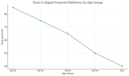 The chart above shows Trust in Digital Financial Platforms by Age Group. Younger age groups (18-24 and 25-34) have the highest trust levels in digital platforms, with 85% and 75% respectively, while older groups (45-54 and 55+) exhibit lower trust, likely due to lower digital literacy and greater concerns over online security.Bottom of Form