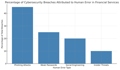 The chart above illustrates the Percentage of Cybersecurity Breaches Attributed to Human Error in financial services. Phishing attacks (45%) and weak passwords (25%) are the most significant contributors, followed by social engineering (20%) and insider threats (10%). This highlights how crucial it is to address human vulnerabilities in cybersecurity efforts.