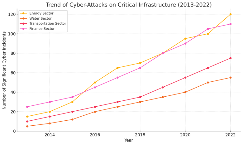 To visualize the frequency and impact of cyber threats on critical infrastructure globally, the following chart displays the volume of significant cyber incidents over the past decade in key sectors like energy, water, transportation, and finance.