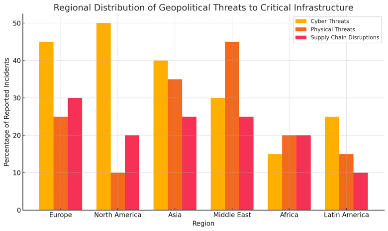 The bar chart shows the regional distribution of different types of geopolitical threats to critical infrastructure. North America faces a high volume of cyber threats, likely due to its advanced digital networks and attractiveness to cyber adversaries. Europe and the Middle East experience significant physical threats, influenced by political instability and regional tensions. Asia faces a balanced mix of cyber and physical threats, reflecting its geopolitical significance and growing infrastructure networks.